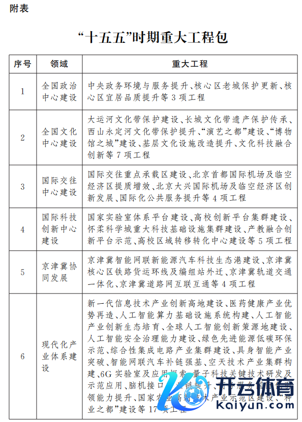 筹划摘抄附表实质清晰,北京市本次发布的“十五五”时间紧要工程包包括寰球政事中心建造、寰球文化中心建造、国酬酢往中心建造、国外科技创新中心建造、京津冀协同发展、当代化产业体系建造、裕如活力的内需体系培育、保险和改善民生、城乡交融区域配合发展、超大城市顾问当代化水平教训、艳丽北京建造和皆门安全建造共12个限制。